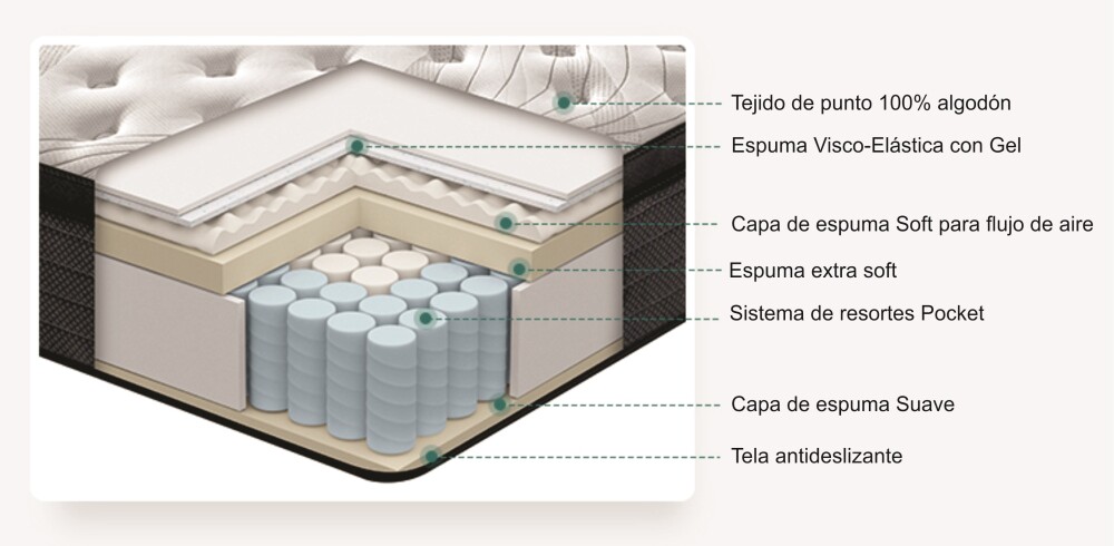 El modelo Serenity cuanta con un sistema de resortes Pocket con 7 zonas de soporte diferentes que reducen sensiblemente el movimiento y la presión a nivel lumbar.